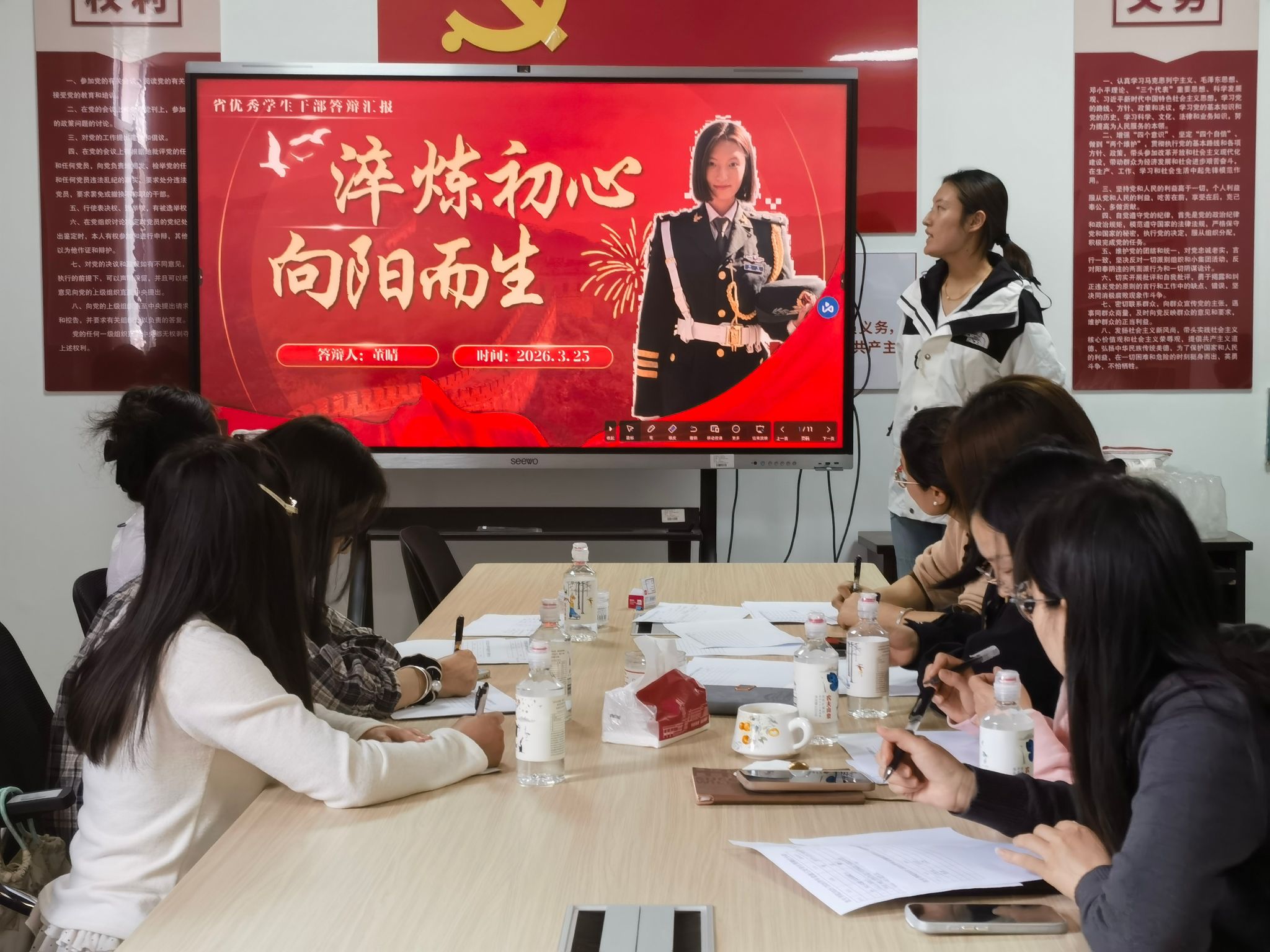 本次评优评先的评选严格遵循公平、公正、公开的原则,全程规范有序开展。参评学生首先通过现场抽签确定答辩顺序,随后按照抽签次序依次上台进行个人答辩。学院专门组建评审小组,特邀辅导员、班主任代表等4位教师以及3位优秀学生代表共同担任评委。