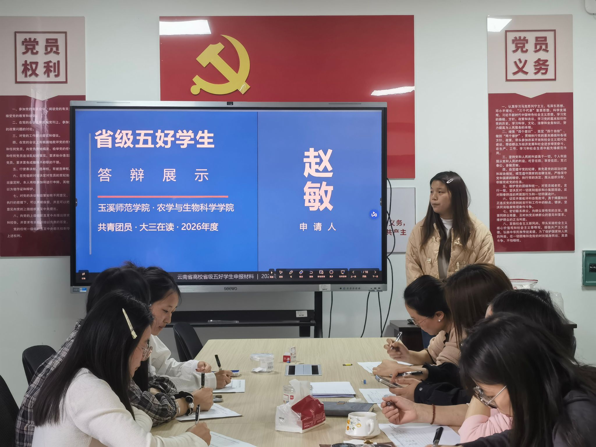 为深入落实立德树人根本任务,培养德智体美劳全面发展的社会主义建设者和接班人,充分发挥优秀学生典型的示范引领作用,农学与生物科学学院于3月25日下午15:00在6教312会议室开展2026年学生评优评先评选答辩活动。此次活动由周芳廷老师主持,农学与生物科学学院无课学生到现场观摩学习。