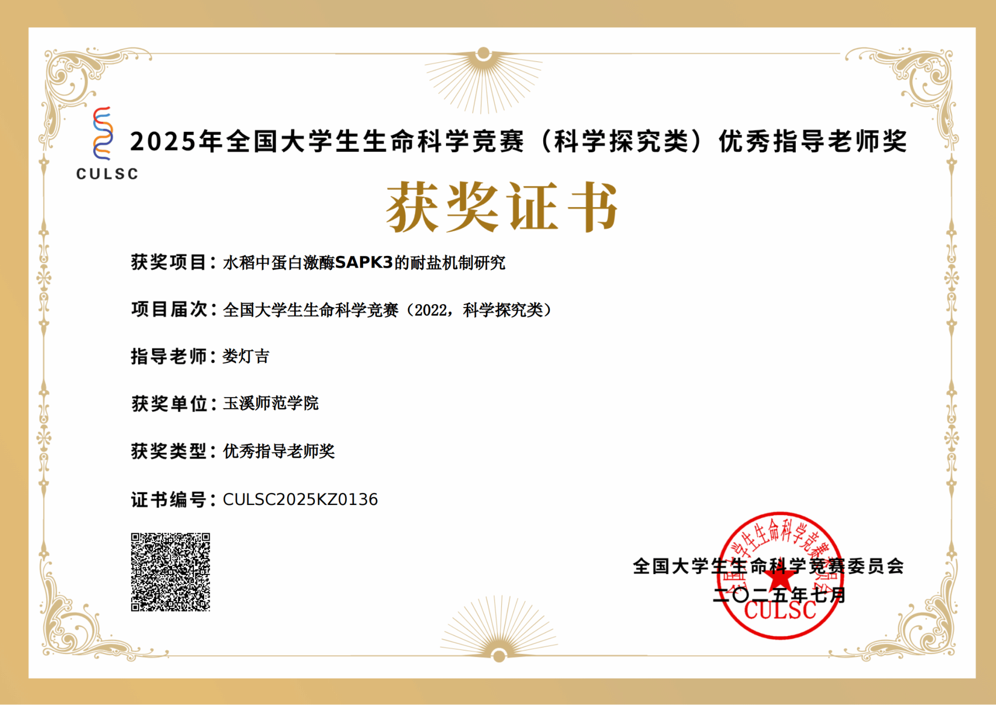 该竞赛是全国大学生A类学科竞赛,是生命科学领域最具影响力和权威性的国家级学科竞赛平台,共吸引来自全国695所高校的21304支团队、8万余名学生参与。经过多轮激烈角逐,最终评选出一等奖494项(获奖率2.32%)、二等奖761项(3.57%)、三等奖2277项(10.69%),并评定出优秀指导教师300名。