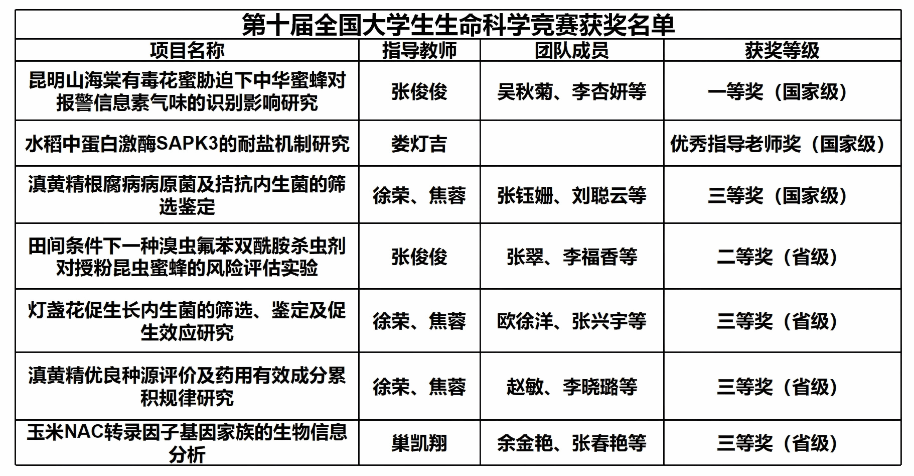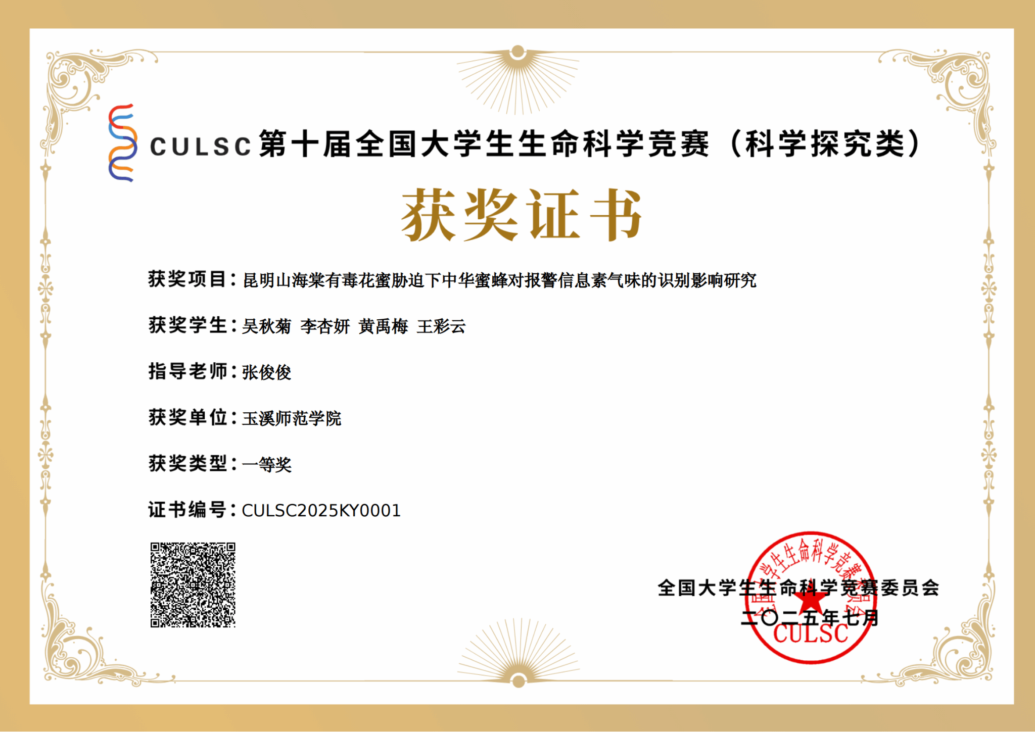 我校农学与生物科学学院参赛团队凭借三大核心优势-扎实的专业素养、创新的科研思维与默契的团队协作,在选题设计、实验论证到数据分析、成果呈现中均体现出严谨的科研态度与突出的创新潜力。其中,作品“昆明山海棠有毒花蜜胁迫下中华蜜蜂对报警信息素气味的识别影响研究”(指导教师张俊俊)得到评审专家的高度认可,荣获国家级一等奖。